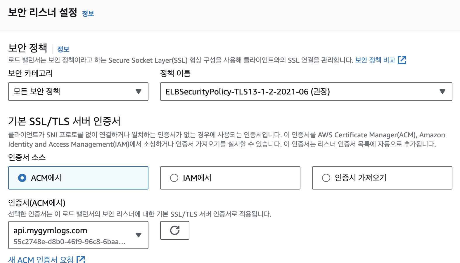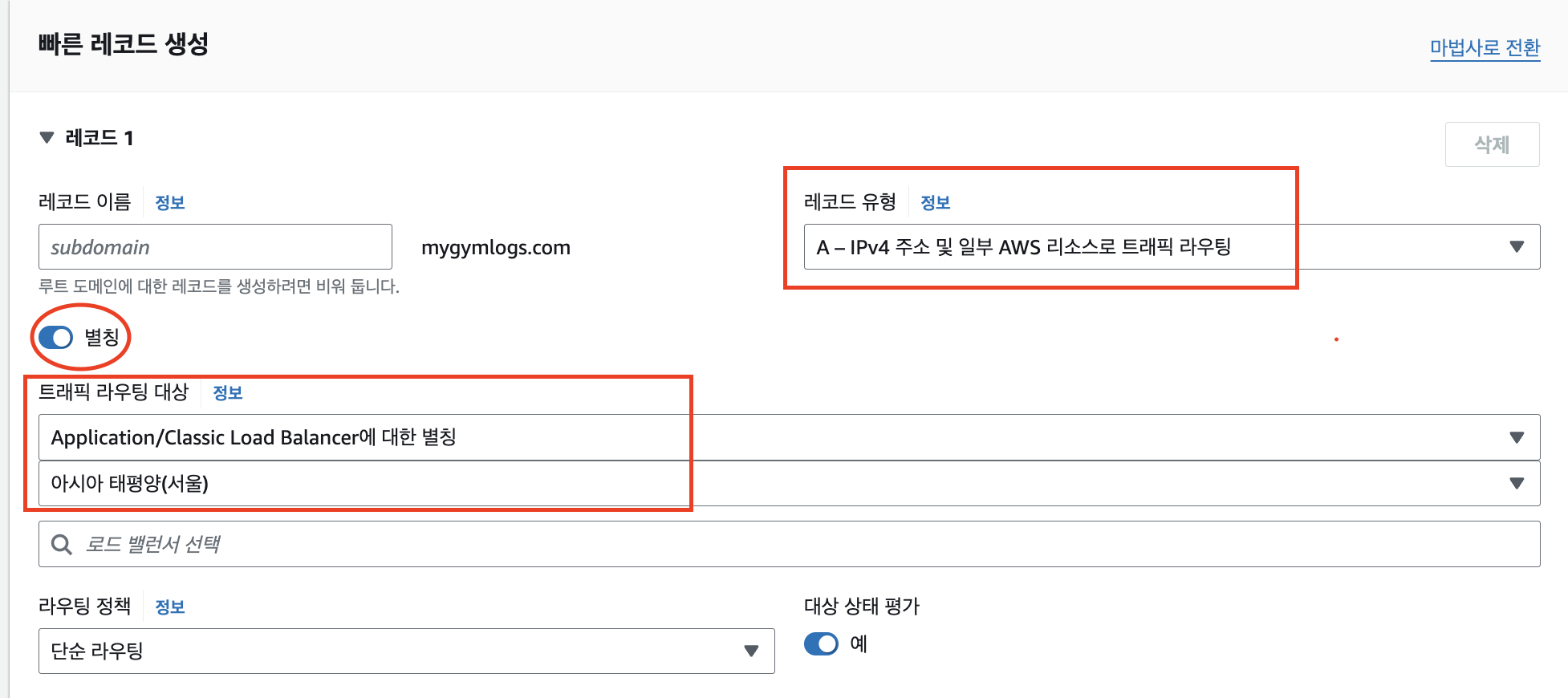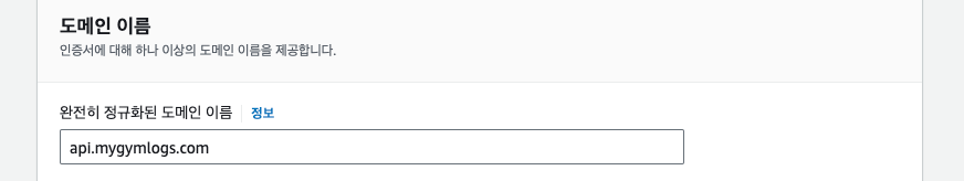 도메인 이름 : 자신이 설정한 도메인이름 입력 (ex) api.mygymlogs.com
