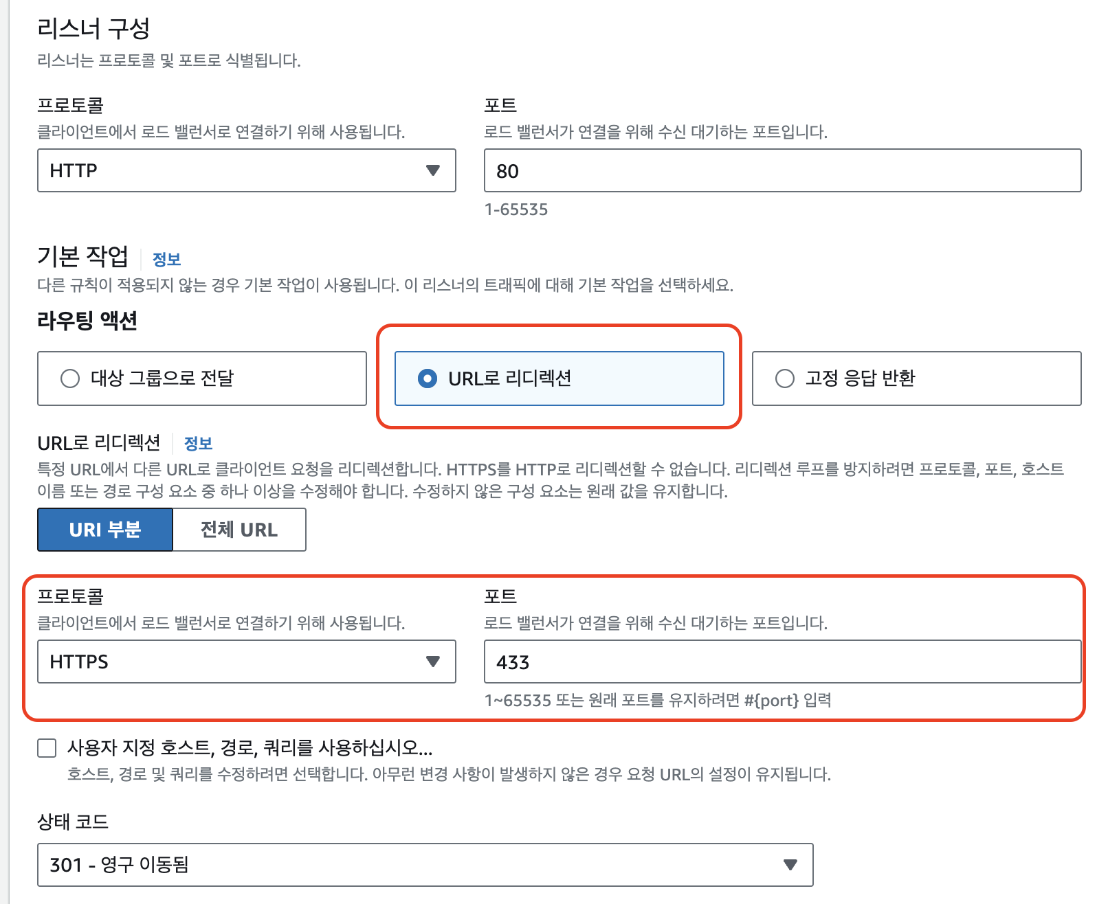 기존 HTTP:80 리스너를 삭제 후 리스너 추가